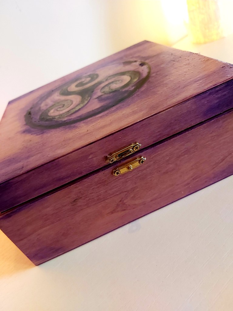 Questa cofanetto in legno dipinto a mano con simbolo della Triskele triplice Dea triple spirale druidista può contenere cristalli, carte degli oracoli, tarocchi, gingilli, erbe, saponi vegetali, oggetti a te cari, o essere utilizzata per custodire gli intenti dei riti, scritte su pergamena di carta.