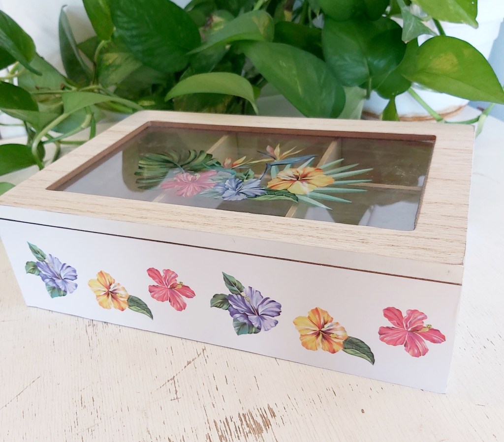 realizzata in legno con fantasia floreale la parte superiore è in vetro.